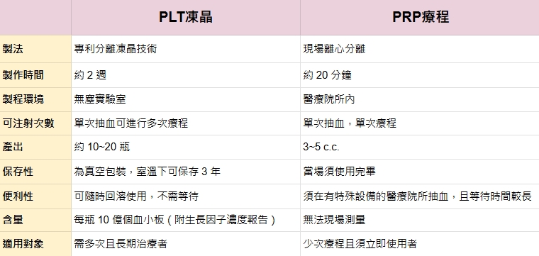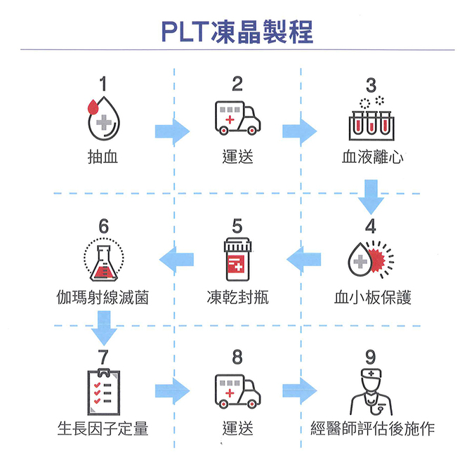 PLT 血小板凍晶技術的優勢在於,能夠明確訂定純化分離所得的血小板含量,讓每瓶安瓶中皆能含有十億個血小板;同時,每批生產的 PLT 血小板凍晶皆透過酵素免疫分析試劑訂定活性濃度,以消除血小板之間的活性差異,讓醫師在使用 PLT 凍晶進行治療時,可以明確知道施打的血小板總量與活性,同時也可用來評估患者治療的效果,並為患者規劃完善的療程。